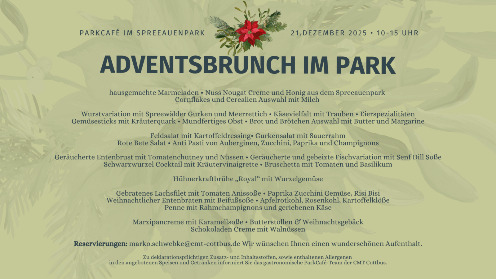 Wir laden Sie zu einem besonderen Advents-Brunch ins ParkCafe im Spreeauenpark ein. Mit Blick auf winterliche Wiesen und die ruhige, mystische Parklandschaft wollen wir gemeinsam eine besinnliche Zeit verbringen – fernab vom Trubel der Vorweihnachtszeit. Genießt feine Köstlichkeiten wie knusprigen Entenbraten und viele weitere festliche Spezialitäten, bevor wir bei einem Spaziergang durch die stille Natur zur Ruhe kommen.